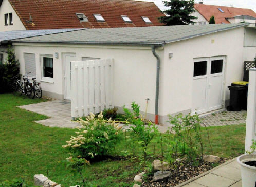 Der Ferienbungalow steht in einem Garten hinter einem Ferienhaus, liegt ruhig, abseits der direkten Straßenverbindung und hat eine Größe von 31 qm. Der Fußboden im gesamten Objekt ist gefließt.