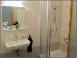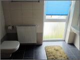 Im Bereich der Schlafzimmer im Obergeschoss befindet sich das Bad, welches über Dusche, Waschbecken, Toiletten und Handtuchhalter verfügt.